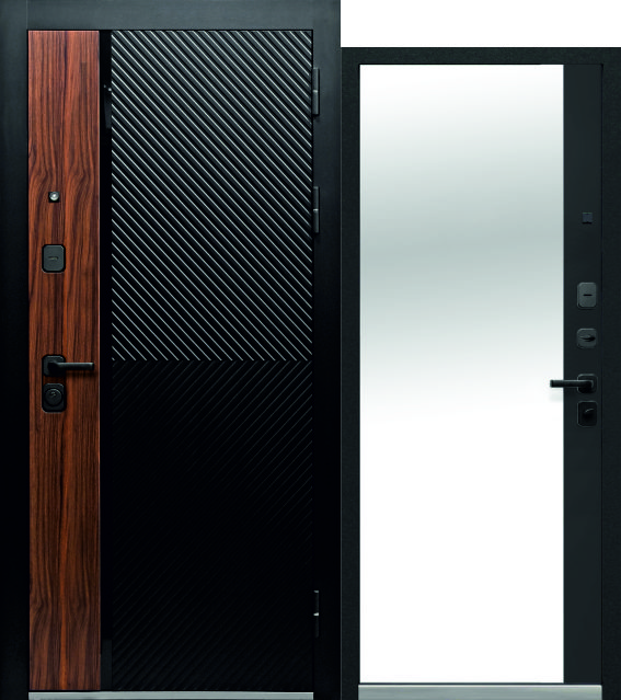 Дверь металлическая Luxor 2МДФ Дуб диагональ зеркало Орех каньон коньяк, сатин черный / Сатин черный