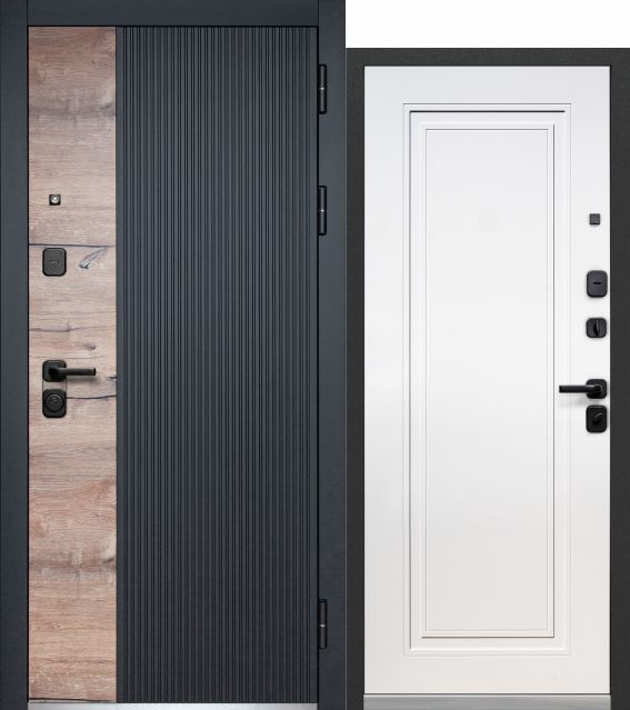Дверь металлическая Luxor 2МДФ Дуб Вертикаль Нео Канадский дуб пацифик, сатин черный / Эмалит белый